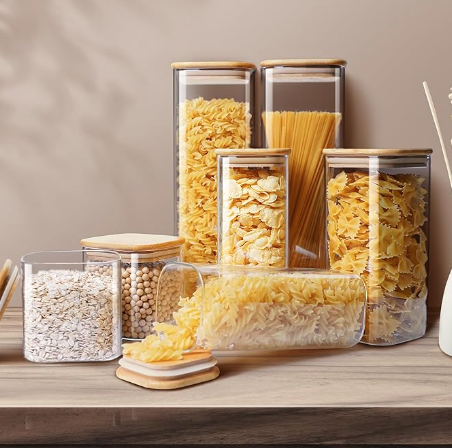 Upgrade your kitchen storage with this set of 5 glass jars with bamboo lids! Featuring three different sizes, these thick, durable borosilicate glass jars are heat and cold-resistant, making them dishwasher and fridge-safe (just hand-wash the lids!). The airtight bamboo lids with food-grade silicone seals keep your food fresh, dry, and pest-free. Plus, their stackable design helps save space and keep your pantry organized. The HD clear glass lets you easily see what’s inside, while the boho-chic bamboo lids add a stylish touch to your kitchen. Bonus: 72 pre-printed and writable labels for effortless organization!