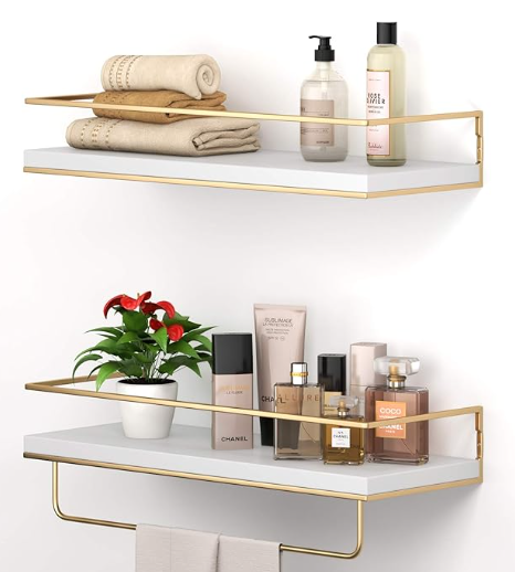 Upgrade your walls with these luxurious cedar wood floating shelves! Handcrafted from solid, damp-proof cedar, they’re durable, stylish, and built to last. With a sleek gold design, they add a touch of modern elegance to any room—perfect for bathrooms, bedrooms, or living spaces. Plus, installation is a breeze with all hardware included, taking less than 10 minutes to set up. Whether you’re looking to declutter, display decor, or add storage, these shelves do it all. Packaged in a gorgeous gift box, they also make a thoughtful housewarming gift!