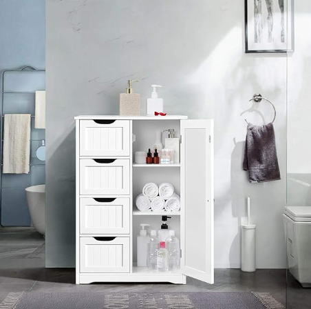 Tidy up your space with this stylish and sturdy bathroom storage cabinet! With a solid structure that holds up to 99 lbs, it’s perfect for organizing toiletries, towels, and more. The four spacious drawers and cupboard with an adjustable shelf make it easy to keep everything neatly tucked away. Designed for humid environments, the waterproof MDF finish ensures durability in bathrooms or kitchens. Plus, its sleek beadboard design blends effortlessly with any decor. Easy to assemble with clear instructions, this cabinet is both practical and elegant—a must-have for any home!
