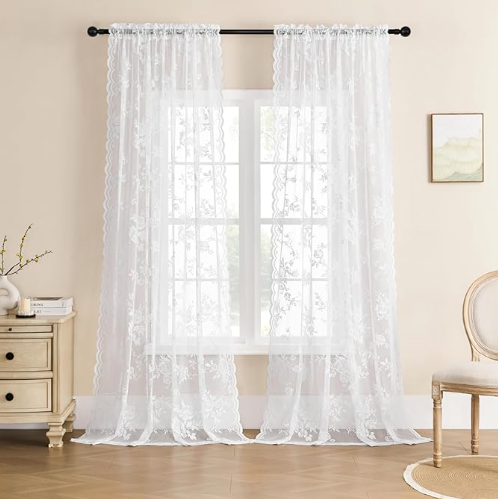 These dreamy white lace curtains are pure cottagecore magic! Made from soft, skin-friendly fabric that’s wrinkle-free and super durable, they drape beautifully while filtering just the right amount of golden sunlight—keeping your space bright and airy while still offering a bit of privacy. The delicate western floral pattern and scalloped edges add the perfect touch of vintage charm, instantly making any room feel cozy and romantic. Plus, with an easy-to-hang dual rod pocket design, they float effortlessly in the breeze, bringing that whimsical countryside feel to your home. And the best part? They’re machine washable, so keeping them fresh and lovely is a total breeze!