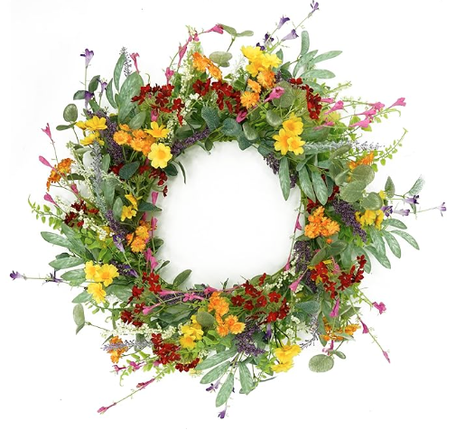 Welcome the beauty of spring and summer into your home with this gorgeous handmade daisy wreath! Featuring vibrant daisies, soft lavender, eucalyptus, and fern branches, this whimsical floral wreath brings a fresh, garden-inspired touch to your front door, entryway, or mantel. The bendable wire branches allow you to adjust and fluff the wreath to its full 20-22″ size, creating the perfect display for your space. Carefully crafted with high-quality materials, this wreath is packaged in a protective gift box—making it a thoughtful present for family or friends. Whether hung indoors or outdoors (under cover to protect from rain and snow!), this charming floral accent is the perfect way to celebrate the season in true cottagecore style!
