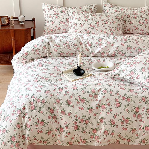 Drift off into a cottagecore dream with this adorable floral duvet cover set! Designed with soft pink blossoms on a cozy cotton fabric, this shabby chic bedding brings the perfect mix of vintage charm and coquette elegance to your space. The zipper closure and corner ties keep your comforter snug and in place, while the lightweight fabric makes it effortlessly comfy. Plus, it’s easy to care for—just toss it in the wash on a gentle cycle, tumble dry low, and it’s good as new! This 3-piece set (duvet cover + two pillow shams) is the sweetest way to turn your bedroom into a whimsical, floral-filled retreat.