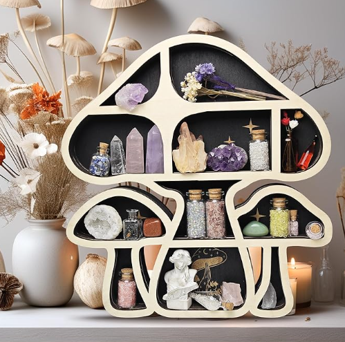 Add a whimsical touch of magic to your space with this adorable wooden mushroom crystal display shelf! Crafted from premium boxwood with a smooth, burr-free finish, this sturdy shelf is designed to safely hold all your cherished treasures—from crystals and healing stones to candles, essential oils, and tiny trinkets. The charming three-mushroom design blends effortlessly into cottagecore, boho, or witchy decor, making it the perfect statement piece for your bedroom, meditation space, or cozy nook. Plus, it’s ready to hang right out of the box! Whether you’re treating yourself or searching for a unique spiritual gift, this enchanting shelf is sure to bring a little extra calm, beauty, and magic to any space.