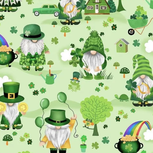 This fabric is absolutely filled with adorable St. Patrick’s Day gnomes in the cutest green outfits, complete with leprechaun hats, shamrocks, and even rainbows! The whimsical design features these little gnomes gardening, holding balloons, and spreading all the lucky vibes. It’s perfect for creating fun and festive projects, from holiday decor to dog accessories that’ll make everyone smile!