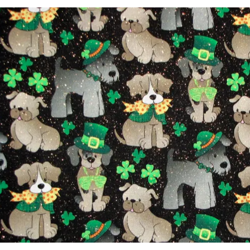 This fabric is a total dog lover’s dream, featuring adorable pups dressed in festive St. Patrick’s Day attire! These playful dogs rock green leprechaun hats, bow ties, and scarves, with shamrocks scattered all around. The glittery black background adds a little extra sparkle to the fun design, making it perfect for crafting unique dog accessories, holiday decor, or any cute DIY project that celebrates both St. Patrick’s Day and our furry friends!