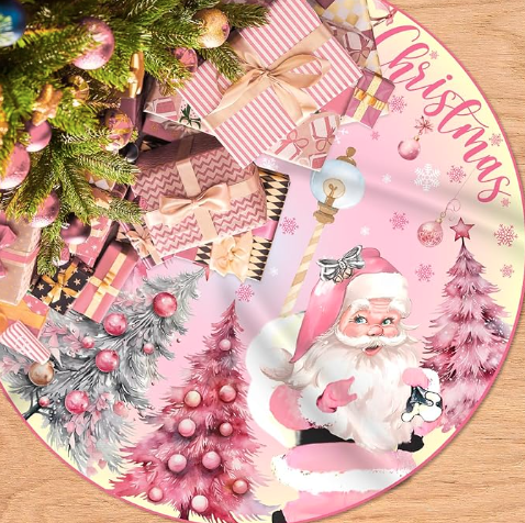This adorable pink Christmas tree skirt brings a vintage holiday vibe with its whimsical design featuring a classic Santa, pink Christmas trees, and festive ornaments. The soft pastel colors and charming illustrations add a touch of nostalgia and cheer to your tree setup. Perfect for anyone embracing a pink-themed holiday decor, this tree skirt creates a cozy, playful foundation for displaying presents and enhances the overall festive look. It’s a delightful way to add personality and warmth to your holiday decor!