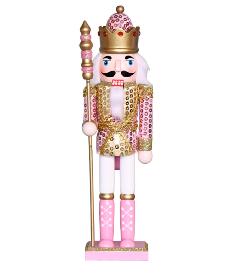 This pink nutcracker is a glamorous twist on a holiday classic! Dressed in pastel pink with gold accents, sparkling gems, and intricate details, it brings elegance and a bit of whimsy to your Christmas decor. Standing tall with a golden crown and staff, this nutcracker is perfect for adding a touch of royal charm to mantels, shelves, or as part of a festive centerpiece. Ideal for anyone who loves a chic, pink holiday theme, this nutcracker makes a unique and stylish addition to your holiday collection.