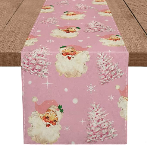 This adorable pink Christmas table runner brings a retro holiday vibe to your decor! Featuring a cheerful vintage Santa and pastel Christmas trees, this runner adds a playful, nostalgic touch to your table. The soft pink background with scattered snowflakes and stars completes the festive look, making it perfect for a merry holiday brunch or a cozy family dinner. It’s a charming way to add a pop of color and whimsy to your holiday setting, instantly bringing warmth and joy to your home!