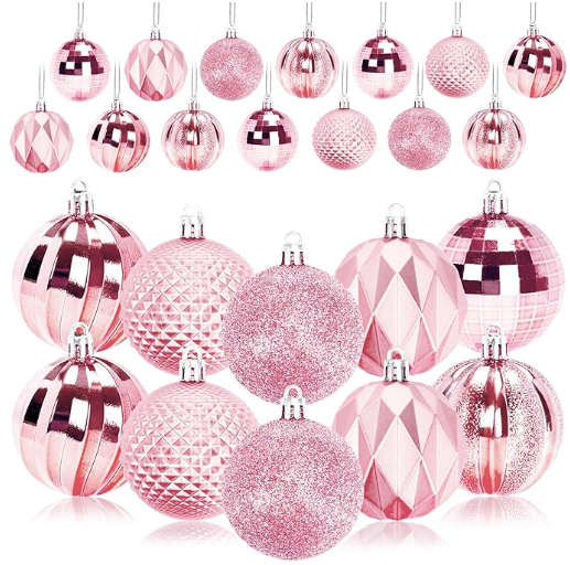 These pink Christmas ornaments are a stunning addition to any holiday decor, bringing elegance and sparkle to your tree. This set includes a mix of matte, shiny, glitter, and textured finishes, creating a beautiful variety that catches the light and adds depth to your decorations. The soft pink tones add a trendy, modern twist to traditional ornaments, perfect for creating a chic, cohesive look on your Christmas tree. Ideal for pairing with other pastel decorations or as a subtle pop of color on a classic green tree!