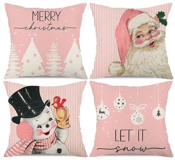 These adorable pink Christmas throw pillow covers bring vintage charm and festive cheer to any space! Featuring classic holiday characters like Santa and a snowman, along with sweet seasonal messages like “Merry Christmas” and “Let it Snow,” each pillow cover adds a playful, retro touch to your decor. The soft pink background and whimsical illustrations make these pillows perfect for a cozy, stylish holiday look on your couch, bed, or favorite chair. They’re an easy way to add warmth and personality to your home this Christmas!