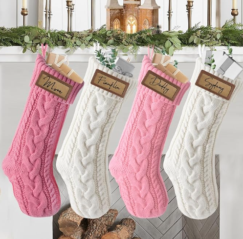 These cozy cable-knit Christmas stockings bring a warm, personalized touch to your holiday decor! Available in soft pink and classic ivory, they’re perfect for adding a bit of charm and elegance to your mantle. Each stocking features a wooden name tag, making it easy to create a custom look for every family member. With their thick, plush texture and timeless knit pattern, these stockings are both stylish and functional—perfect for filling with treats and gifts this Christmas!