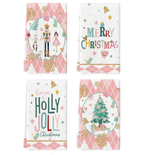 These delightful pink Christmas dish towels add a festive and cheerful touch to your kitchen! Featuring whimsical holiday designs like a nutcracker, Christmas tree, and joyful seasonal messages, each towel brings a playful and vintage-inspired vibe to your holiday decor. The soft pink and pastel colors, accented with gold details, make them perfect for anyone looking to brighten up their kitchen with a touch of holiday magic. Functional and fun, these towels are great for spreading Christmas cheer while handling all your holiday baking and cooking needs!