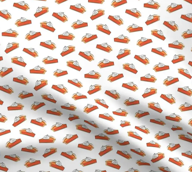 This charming fabric features a delightful pattern of pumpkin pie slices, each topped with a dollop of whipped cream. These whimsical illustrations are scattered across a clean white background, creating a cheerful and festive look that’s perfect for fall. The warm color palette of orange, tan, and white captures the essence of pumpkin pie, making it ideal for fall-themed projects like table linens, kitchen accessories, or even festive pet bandanas.