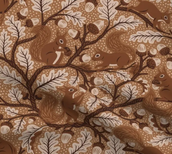 This adorable fabric features a woodland-inspired design filled with playful squirrels, acorns, and oak leaves against a warm, earthy brown background. The squirrels are illustrated in charming poses, gathering acorns among branches and leaves, creating a cozy, whimsical scene reminiscent of a fall forest. Soft white and beige accents highlight the leaves and acorns, adding texture and depth to the design. Perfect for autumn-themed projects, this fabric would make lovely table runners, children’s accessories, or cozy home decor pieces, bringing the magic of the forest indoors.