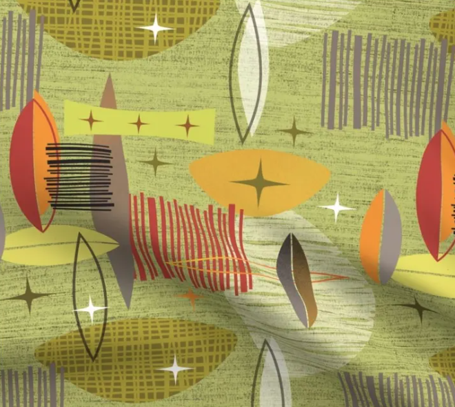 This fabric features a retro, mid-century modern design inspired by the Atomic Age, with a playful mix of abstract shapes, starbursts, and lines in earthy greens, yellows, oranges, and reds. The background has a textured look, adding depth and a vintage feel, while the geometric forms and star accents evoke the futuristic optimism of the 1950s and 60s. This fabric would be perfect for adding a nostalgic, yet stylish, touch to home decor items, such as cushions, curtains, or table linens, as well as for crafting unique accessories with a timeless, retro flair.