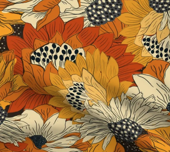 This striking fabric showcases a bold, retro-inspired floral design with large sunflowers and daisies in vibrant shades of orange, mustard, and cream. The intricate details of the petals and dotted centers give each bloom a dynamic and textured look, adding depth to the pattern. The warm, earthy colors and oversized flowers evoke a nostalgic autumn vibe, making this fabric ideal for seasonal projects. Whether used for statement clothing, throw pillows, or bags, this fabric brings a touch of vintage flair and warmth to any creation, perfect for fall enthusiasts and retro lovers alike.