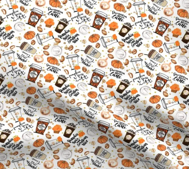 This playful fabric celebrates all things pumpkin spice, featuring a charming pattern of pumpkin lattes, whipped cream-topped coffees, muffins, pumpkins, coffee beans, and cozy autumn phrases like “pumpkin spice latte” and “happiness in a mug.” The illustrations are scattered across a white background with warm tones of orange, brown, and cream, capturing the essence of fall’s favorite flavors. Perfect for making seasonal accessories, kitchen towels, or even café decor, this fabric is a must-have for pumpkin spice lovers looking to add a little extra warmth and personality to their fall projects.