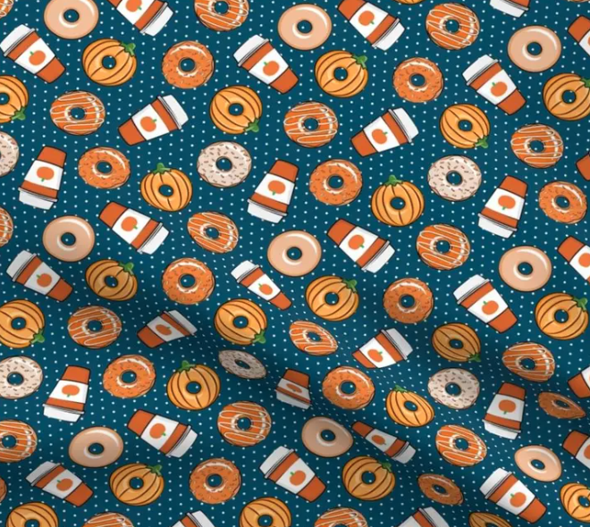 This fun and festive fabric features a delightful pattern of coffee cups, donuts, and pumpkins, all set against a teal background with tiny white polka dots. The coffee cups and donuts are decorated in warm fall tones of orange, cream, and brown, capturing the cozy vibe of autumn treats. Each element is playfully arranged, making this fabric perfect for seasonal accessories, kitchen decor, or quirky apparel. It’s a great choice for anyone wanting to add a touch of sweetness and fall flavor to their projects, perfect for coffee and donut lovers alike!