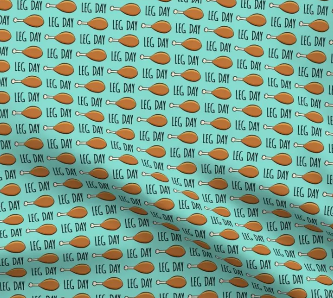 This fabric has a fun, humorous design featuring illustrations of turkey drumsticks paired with the phrase “LEG DAY” in a bold, playful font. The drumsticks and text are arranged in a repeating pattern on a light teal background. The drumsticks are a warm, brown-orange color, which contrasts well with the teal backdrop, adding a lighthearted touch. This fabric would be perfect for Thanksgiving-themed projects, gym humor items, or quirky accessories, adding a bit of festive humor and personality.
