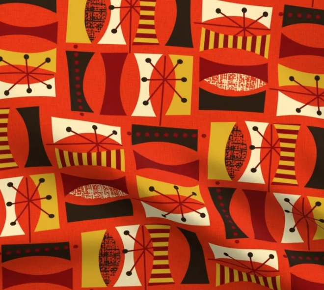 This fabric features a retro, mid-century modern design with a bold geometric pattern in warm shades of red, orange, mustard yellow, brown, and cream. The pattern consists of abstract shapes like ovals, hourglass figures, and atomic starbursts arranged in a grid-like format, creating a sense of movement and visual interest. The shapes are filled with contrasting textures and patterns, such as stripes and dots, adding depth and complexity to the design. This fabric would be ideal for vintage-inspired projects, home decor accents, or statement apparel, evoking a 1950s-60s nostalgic vibe.