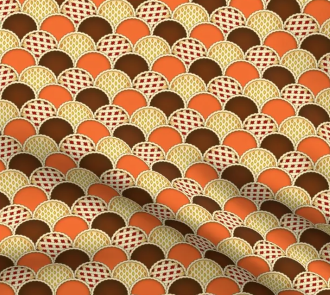 This cozy fabric is perfect for fall, featuring a playful “harvest pies” theme with a pattern of scalloped shapes that resemble different pie tops. In warm shades of orange, golden yellow, and deep brown, each “pie” has its own unique texture, like lattice and dotted patterns, capturing the charm of homemade desserts. It’s an ideal choice for adding a touch of autumn warmth to kitchen linens, table runners, or seasonal decor, making any project feel inviting and deliciously nostalgic.