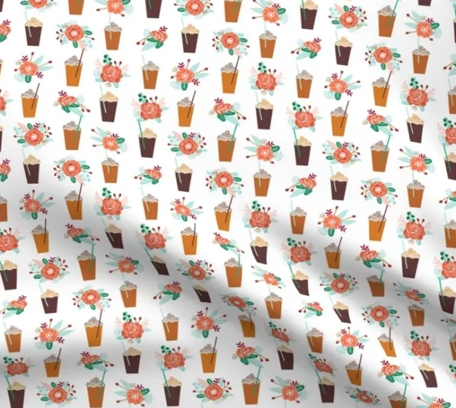 This charming fabric brings together the cozy vibes of autumn with an adorable mix of pumpkin spice lattes and floral bouquets, scattered across a clean white background. The design features cute coffee cups filled with whipped cream and straws, alternating with soft-colored flowers in shades of orange, teal, and brown, giving it a warm, festive feel. Perfect for the pumpkin spice lover, this fabric would be great for creating seasonal accessories, kitchen decor, or fun DIY projects to celebrate fall’s favorite flavor in style!