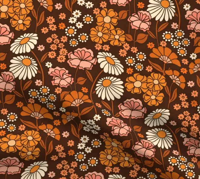 This fabric exudes a nostalgic, vintage charm with its bold floral pattern set against a rich brown background. Featuring large daisy-like blooms in shades of cream, orange, and soft pink, interspersed with smaller flowers, this design has a playful, retro vibe reminiscent of 1970s fashion. The warm, earthy tones and flowing floral shapes make it perfect for adding a cozy, retro touch to projects like clothing, bags, or home decor accents. It’s an ideal fabric for anyone looking to bring a bit of vintage flair and cheerful floral energy into their creations!