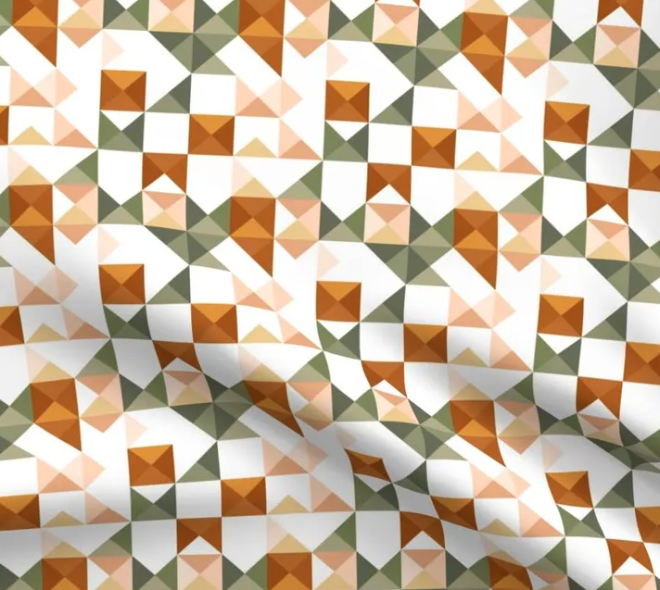 This fabric features a modern patchwork-inspired pattern with a geometric twist, perfect for fall. In a palette of warm autumn tones like rust orange, olive green, and soft peach, the design showcases angular shapes and triangles that interlock in a visually engaging way against a crisp white background. The clean, minimalist arrangement of colors and shapes gives it a contemporary look while still capturing the cozy feel of autumn. Ideal for quilting, home decor accents, or stylish accessories, this fabric brings a fresh take on traditional patchwork with a seasonal flair.